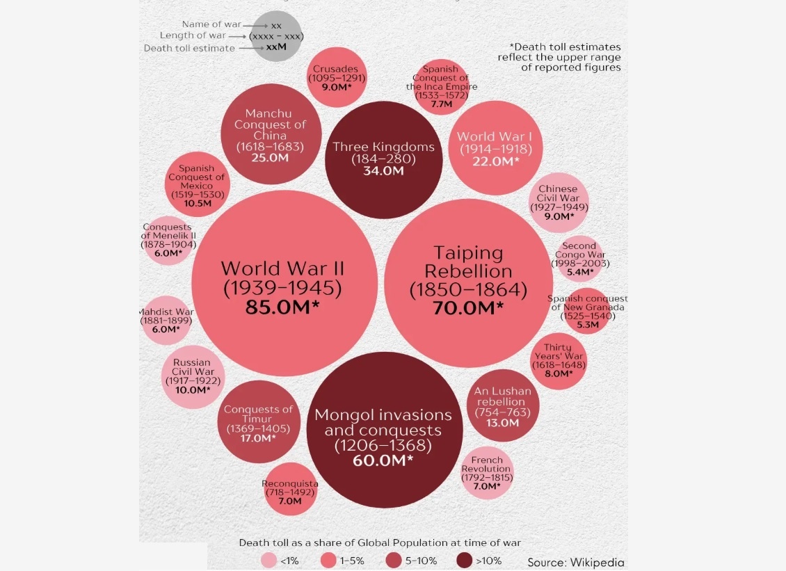 1) Эта визуализация показывает цену войн, и позволяет понять масштабы потерь, человеческих жизний, в различных конфликтах нашей истории. Только Вторая мировая война унесла около 85 миллионов жизней, Тайпинское восстание 20-70 миллионов, Монгольские нашествия и завоевания 20-60 миллионов, Троецарствие 34 миллиона, Манчжурское завоевание Китая 25 миллионов, Первая мировая война15-22 миллионов, Завоевания Тимура 7–17 миллионов1,94, Восстание в Лушане13 миллионов, Испанское завоевание Мексики10,5 миллионов. Некоторые из этих конфликтов унесли жизни более 10% населения мира, изменив общества на многие поколения: 2) В руках этих государств, сосредоточено все самое смертоностное: 3) Лживый рейтинг одобрения мировых лидеров. Напомню, что Ким Чен Ына в КНДР поддержало 99.4% изберателей. 4) А так выглядит мировая свобода интернета в разных странах, по мнению запада: 5) Все страны экспортирующие вооружение: 6) Корупция в Латинской Америке: 7) Ситуация с внешним долгом в Латинской Америке: 8) Пока