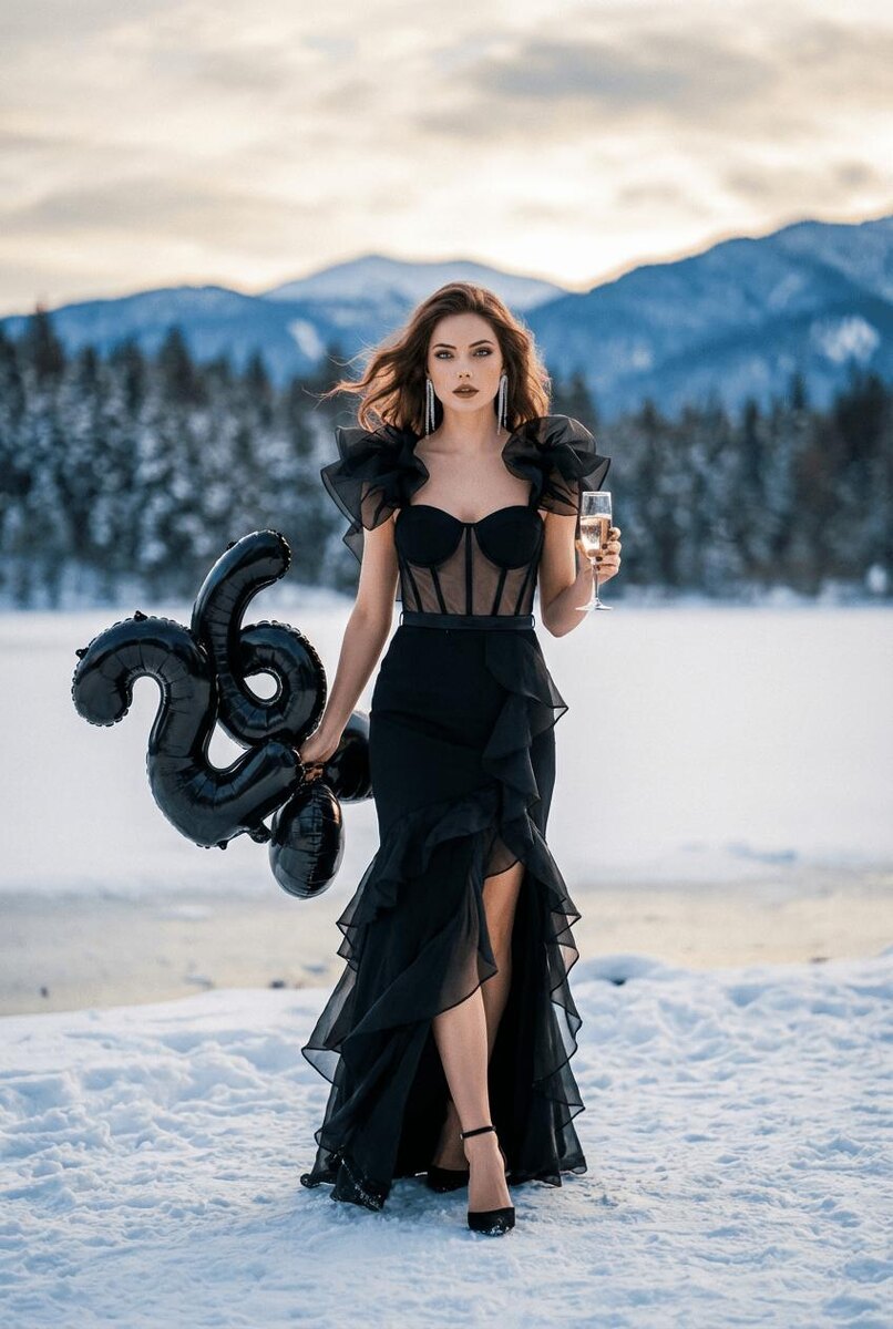 Сгенерировать фото⚡️ Перейти в бота 🤖 Сохрани черты лица девушки с фото. Сделай макияж. Фотореалистичный fashion-editorial, проф. фото. Полный рост, вертикаль 2:3, центр, лёгкий нижний ракурс, уверенная походка. Левая рука — глянцевые чёрные шары «26», правая — бокал игристого. Чёрное вечернее платье: корсетный лиф с illusion-mesh, объёмная органза на плечах, узкий ремень, юбка в пол с каскадными ruffles и высоким разрезом. Проф-макияж, чёрные ankle-strap pumps, длинные серьги, ветер. Локация: заснеженный берег замёрзшего озера, хвойный лес, голубые горы. Свет пасмурного golden hour: мягкий тёплый rim-light, холодная палитра с тёплыми хайлайтами кожи. Малая ГРИП, мягкий bokeh, детальные ткани и реалистичные отражения, кино-грейд, лёгкое плёночное зерно. Без артефактов и анатомических ошибок. Identity lock: лицо 100% идентично референсу, без любых изменений.