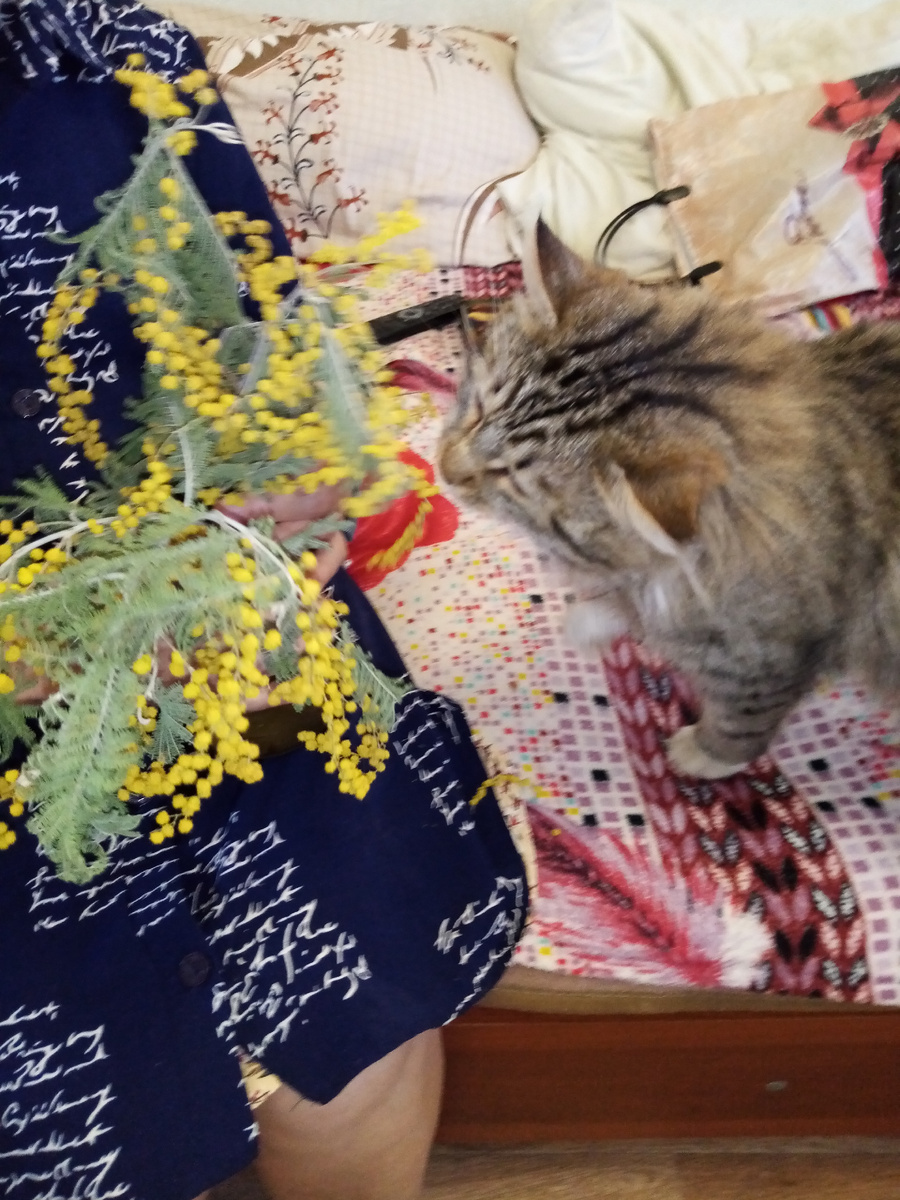 Кто бы мог подумать, что веточка мимозы станет объектом соблазнения нашего кота😄
