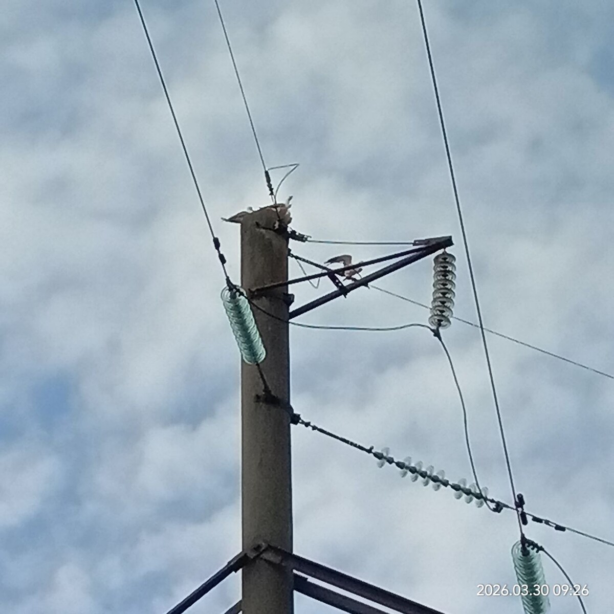 На опоре высоковольтной линии передачи тока высокого напряжения.
