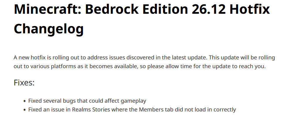 При этом стоит учитывать, что Mojang выпускает 26.12 постепенно на разные платформы. Поэтому если на Android обновление ещё не появилось, это не обязательно значит, что с устройством что-то не так. В подобных случаях чаще всего нужно просто немного подождать, пока хотфикс дойдёт до конкретной платформы.