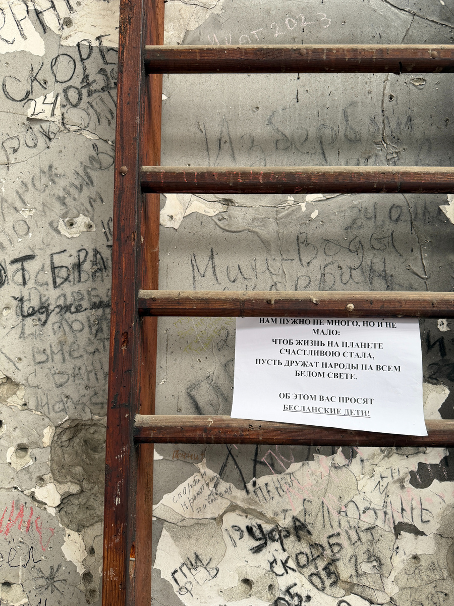 По старенькой лестнице спускаемся на 1 этаж. "Дети - самое святое на земле", - написано на испещренной пулями стене. В Беслане с этим трудно не согласиться...