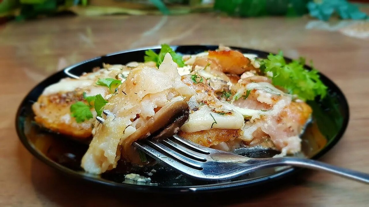 Ваш восхитительный сом с грибами и овощами в сливочном соусе готов. Приятного аппетита!