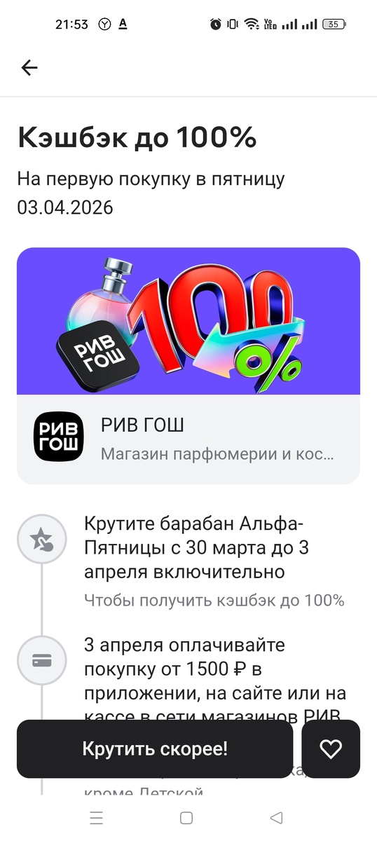 Дзен егозит, с не знаю какой попытки, зашла и пишу. Ура! Всем привет! Рада Вас видеть у себя на канале! Самый жаркий день по погоде за март и апрель (судя по прогнозу) подходит к концу. У нас сегодня было +19, мне даже нехорошо от таких погод(((. Пришла с работы и вырубилась. Ничего, завтра уже поменьше. И дождь. Посмотрим. Драгоценные, все, первый квартал тю-тю. Месяц тоже туда же. Кто любит подводить итоги, время пришло. Я только расходы посчитала и успокоилась. Так, для статистики. Как есть и ладно. А раз месяц к концу, то платим за интернет и выбираем категории кешбеков на следующий. Со вторым наверное оставлю на завтра, что-то у меня какая-то усталость скопилась, на свежую голову завтра. И еще парочку моментов скажу, с которыми столкнулась и что попробовала сама. В этот раз косметическое. Альфа предлагает кешбек в РивГош. Не в первый раз такое случается, в течение года может быть раза 3, а то и больше точно бывает у Альфы. На наших с мужем картах выпало 20 и 30 %. Смотрим усл