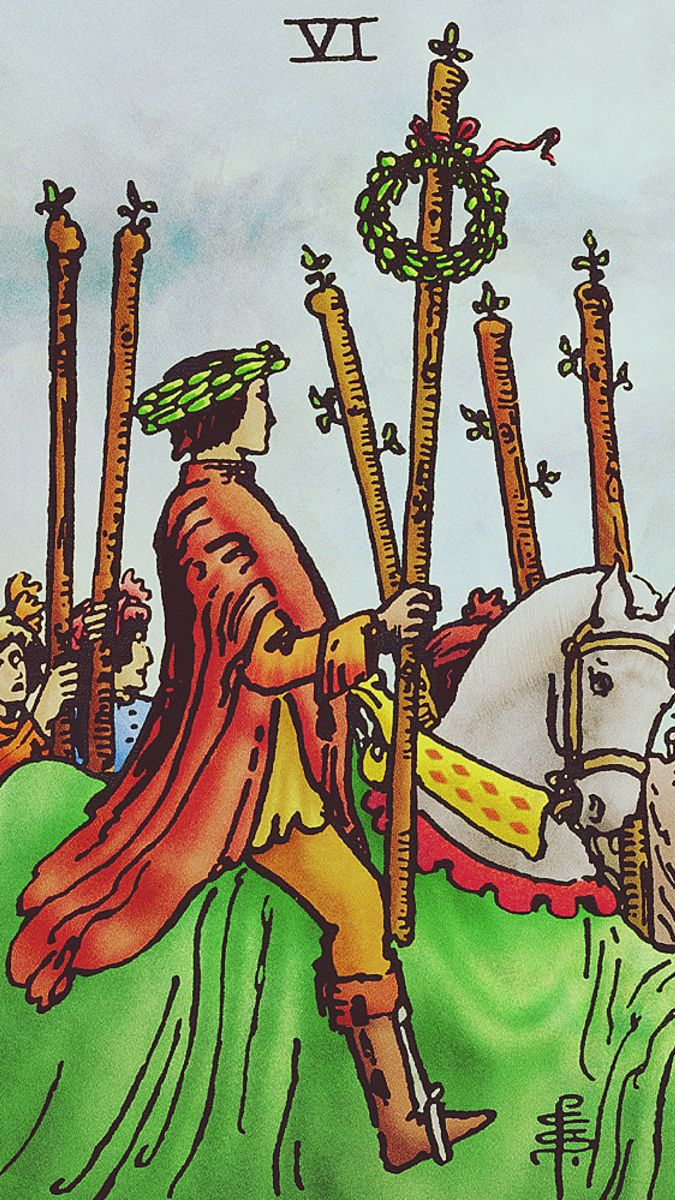 Шестерка Жезлов - это своего рода отражение Аркана Влюбленные на более «земном» уровне. Там выбор сердцем, а здесь уже как будто результат этого выбора. То есть, можно сказать, что человек сделал правильный шаг и получил за это «награду» - признание, внимание, ощущение, что всё сложилось так, как он хотел.