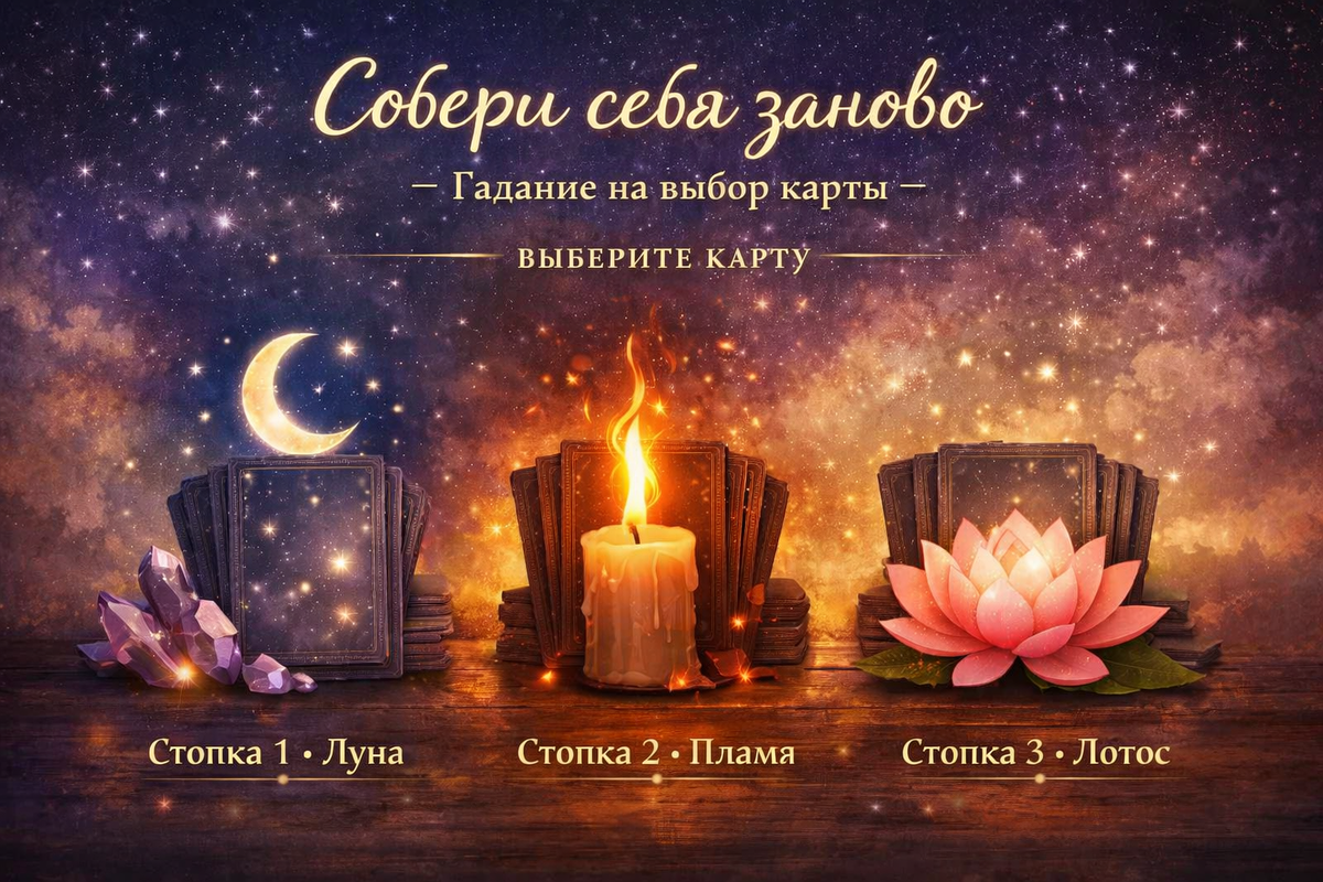 Сделайте глубокий вдох, медленный и ровный. Сосредоточьтесь на своей нынешней ситуации. Выберите ту стопку, к которой Вас тянет сильнее всего, без лишних объяснений. Стопка 1 - Луна. Стопка 2 - Пламя. Стопка 3 - Лотос. Вам не нужно срочно себя чинить. Вам нужно себя почувствовать. Сейчас Вы можете быть перегружены, растеряны или просто эмоционально выжаты до тишины внутри. Дорога назад лежит не через контроль, а через принятие. Ваш путь исцеления: Позвольте себе поплакать, вести дневник или просто посидеть в тишине. Перестаньте насильно добиваться ясности - ответы придут постепенно, своим чередом. Берегите свою энергию от людей, после которых внутри становится пусто. Послание: Вы не сломаны. Вы проживаете нечто глубокое. Чем больше Вы позволяете своим чувствам быть, тем быстрее возвращаетесь к себе. Вы собираете себя заново через действие и дисциплину. Вы слишком долго находились в застое или в состоянии упадка. Сейчас Вам нужно движение, даже если поначалу оно кажется неудобным и чужи