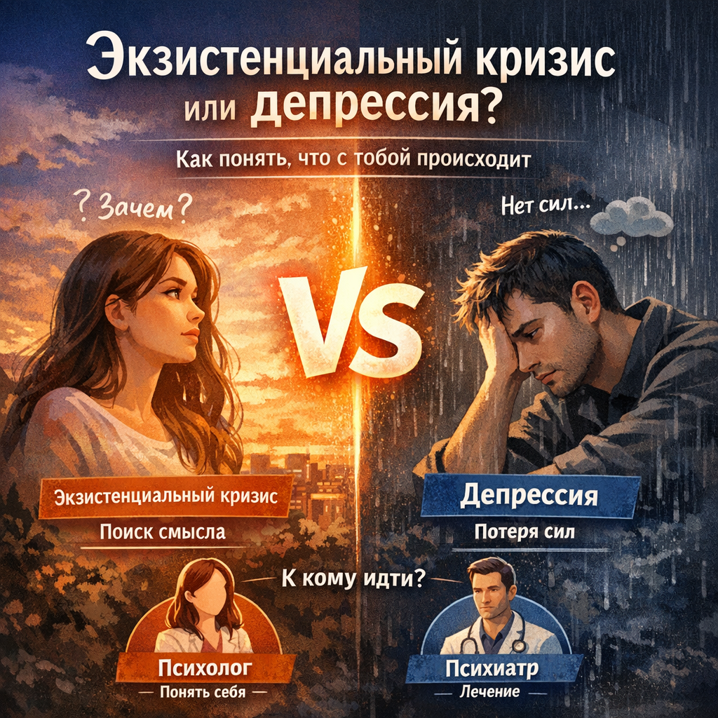 Экзистенциальный кризис — это состояние, при котором человек переосмысливает свою жизнь, ценности и цели. Часто он возникает в переломные моменты: