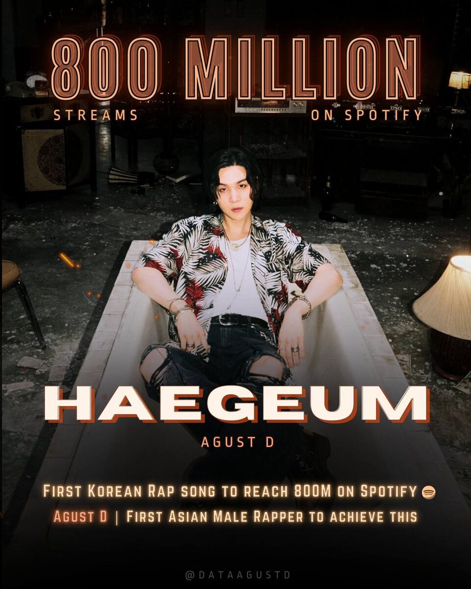 Это первая корейская рэп-песня, достигшая этого рубежа, что делает Юнги первым и единственным азиатским рэпером-мужчиной, которому это удалось! cr.dataagustd #SUGA @kumihobts