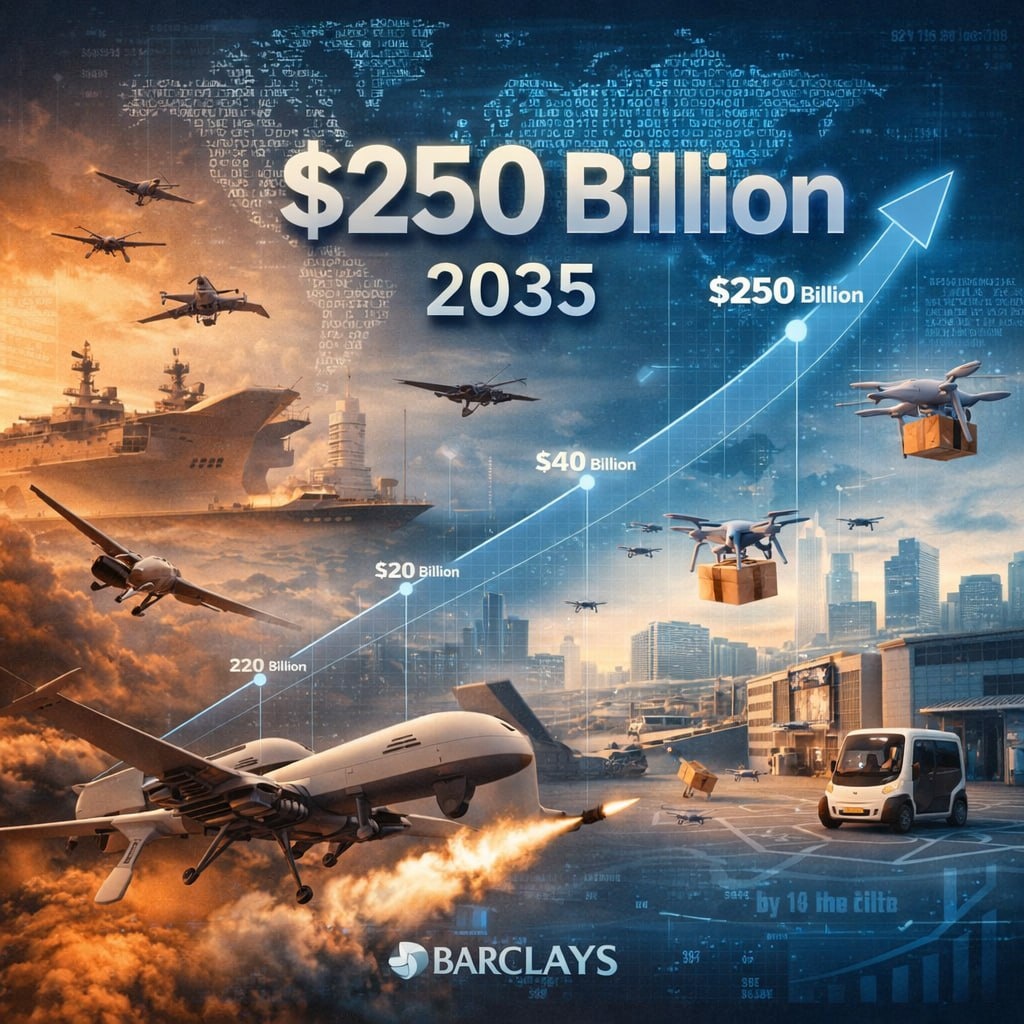 Оценка 🇬🇧 британского финансового конгломерата Barclays Мировой рынок беспилотных систем вошел в фазу сверхбыстрого роста и в ближайшее десятилетие станет одним из ключевых сегментов глобальной экономики и оборонно-промышленного производства. Как сообщает CNBC со ссылкой на отчет Barclays, в 2020 году объем мирового рынка дронов составлял 20 млрд долларов США, к 2025 году он увеличился до 40 млрд долларов США, то есть фактически удвоился за пять лет. По итогам 2026 года ожидается дальнейший рост до 50 млрд долларов США, а к 2035 году мировой спрос на военные и гражданские беспилотные аппараты должен достичь 250 млрд долларов США. Таким образом, по сравнению с текущим уровнем рынок вырастет в 5 раз, а по сравнению с 2020 годом — в 12,5 раза. Согласно оценке Barclays, такой рост будет обеспечен прежде всего стремительным развитием технологий искусственного интеллекта и дальнейшей автономизацией беспилотных систем. Экономический смысл этого процесса состоит в том, что расширение автон