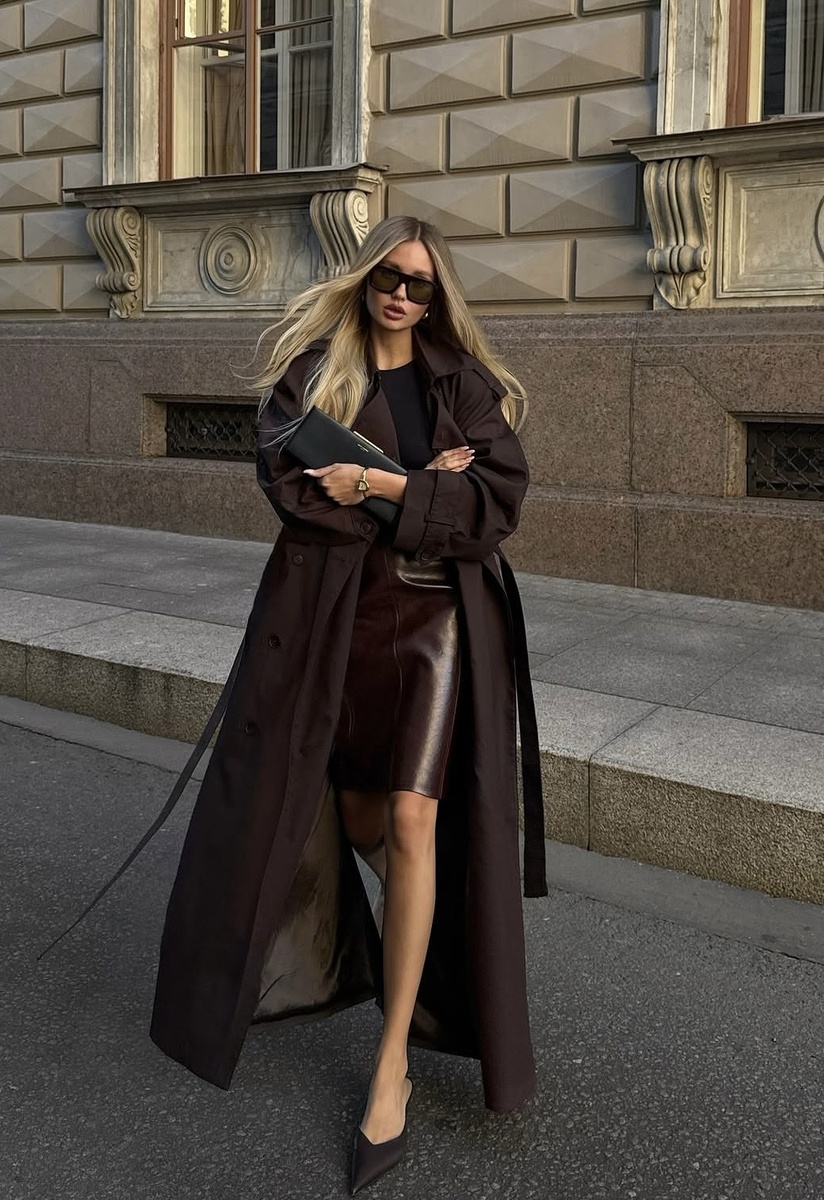 Длинный тренч с мини-юбкой — один из трендов весны 2026 года. Контраст длин придает образу динамичность и свежесть, сохраняя элегантность. Этот стиль напоминает эстетику 1960-х, делая его актуальным и современным.Так как в этом образе ноги играют ключевую роль, подбор обуви приобретает решающее значение.Для дерзкого или вечернего варианта подойдут сапоги на шпильке или туфли-лодочки.