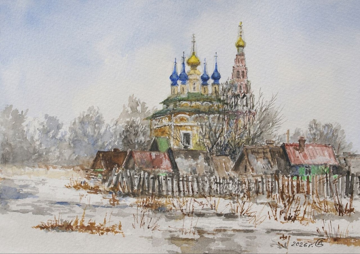 Весенний день в деревне - бумага/акварель, 15х21, 2026