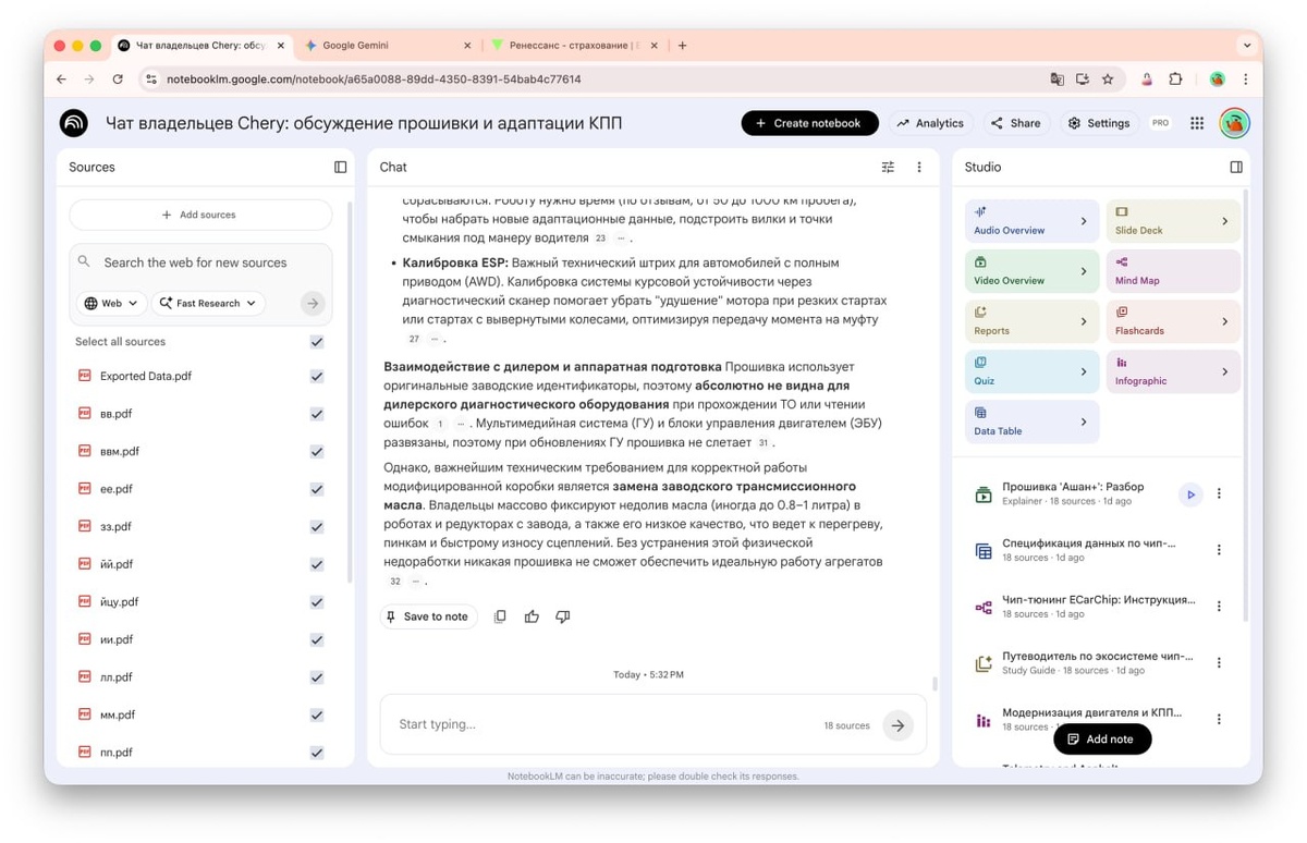вопросы-услуги-идеи и т.п. У меня авто Exeed (RX) и я подписан на ряд ну очень активных чатов владельцев, где оные обсуждают всяко разно. Выделил час времени, скачал с начала прошлого года все переписки (Телеграмм дает это легко сделать), получил массу html на выходе, быстро сконвертировал это в PDF, добавил в Google NotebookLM и ... сижу, задаю вопросы, получаю ответы из опыта. Шикардос. Купленная подписка держится, вот здесь покупал - пока нормик. Можно залить до 300 (!) документов, в лимиты еще не упирался. Плюс в том, что ИИ работает строго (!) по залитым документам, не выходя в сторону. Таким образом можно ведь любой чат анализировать и искать потребности для бизнеса. Как это говорят - боли искать :)