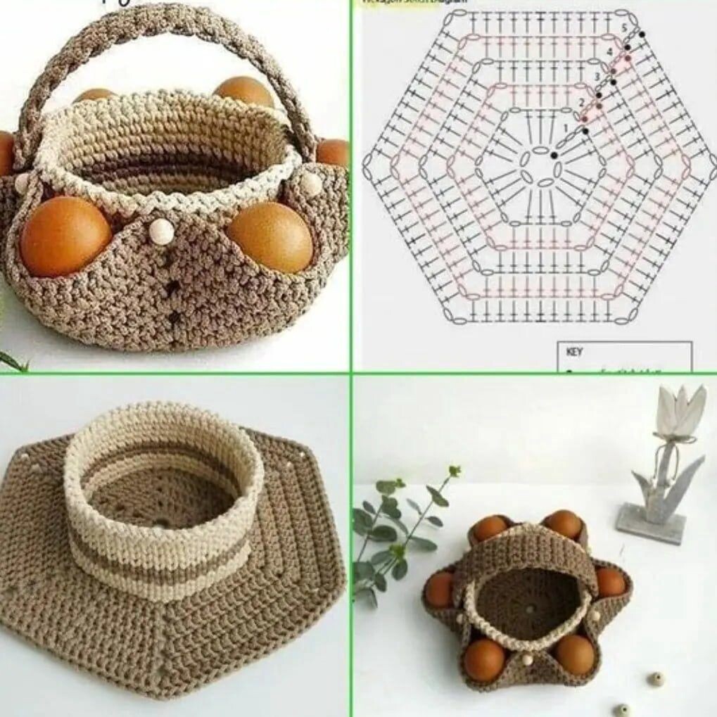 Для украшения праздничного стола на Пасху связала простую и милую корзинку для яиц. Схему нашла в интернете. Схема простая, корзинка вяжется быстро. Можно связать из остатков пряжи. Получится ярко и празднично. Я вязала крючком №2 из пряжи Ярнарт Джинс. У меня было всего два моточка: один зеленого цвета, второй - бордового. Тоже какие-то остатки. Такое получилось донышко. Место для кулича связала контрастной нитью. Пряжа мягкая, поэтому получается округло. Но это не отменяет красоты. Бортики подвязала нитями зеленого цвета. Кулича пока нет, но композиция мне уже нравится. Всем добра и света!!!