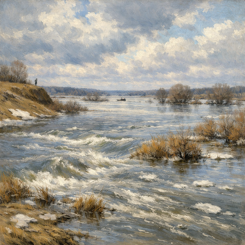Есть такие короткие весенние дни, когда природа будто резко вспоминает свою силу. Вода идёт широко, овраги шумят, лёд уже ушёл, а река вдруг становится не тихой полосой между берегами, а почти отдельной живой стихией. Смотришь на неё — и чувствуешь: это не навсегда, но сейчас ей дан полный ход. Об этом и говорит пословица: «Играй пока, матушка Ока, апрель на дворе». Это старая апрельская пословица, зафиксированная у Даля среди весенних примет, и по её окружению хорошо видно, что речь идёт о большой воде, разливе и силе реки в апреле. Смысл у неё простой, но красивый. Пока стоит апрель, Оке можно «играть» — шуметь, разливаться, жить в полной воде. Здесь нет пустой красивости. В народном слове «играй» сама вода уже почти живая: она движется, гуляет, переливается, берёт своё пространство после зимней тесноты. Весной дед вывел внука к берегу. Ока была совсем не такой, как летом: широкой, шумной, тёмной, с быстрым ходом воды. Вдоль низких мест уже стояли лужи, на изломе берега крутило вет