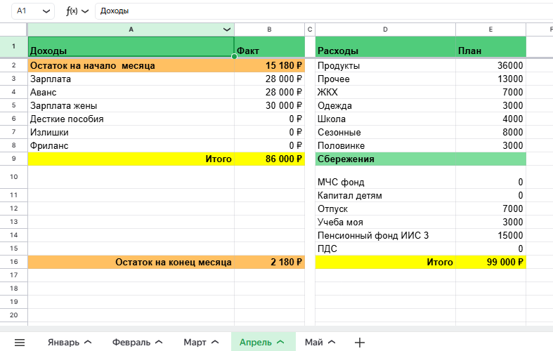 Сейчас я покажу вам, как я сам веду учёт семейных финансов с помощью приложения и таблицы. 📅 Раз в месяц В последний день месяца подбиваю остатки денег на счетах, которые не потратил (это не сбережения), и заношу в таблицу. Доходы, которые «может быть будут», в бюджет не включаю. Эти деньги распределяю в следующем месяце. Распределяю бюджет на месяц. Смотрю, чтобы остаток на конец месяца был минимум 2–3 тысячи. В приложение «Дзен-мани» переношу бюджеты по каждой категории. 📱 Каждый день Записываю расходы в приложение. В нём мне нравится, что очень удобно видеть по дням, сколько денег осталось. Таблицу после этого больше не веду 😁 Если ты только начинаешь, рекомендую фиксировать траты в таблице раз в неделю, чтобы видеть более четкую картину по неделям. 📌 Категории, которые мы контролируем У нас всего их три: 👉 продукты 👉 прочие покупки 👉 ЖКХ Остальные расходы - по системе конвертов. 💰 Как работают «конверты» Например, мы открыли сберегательный счёт и назвали его «Школа» - это д