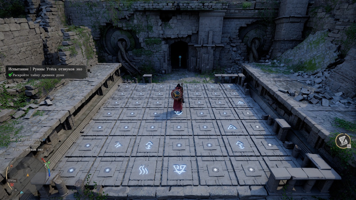 В этой загадке есть плитки с символами, которые нажимаются, когда персонаж на них наступает. Если вы совершаете ошибку, все плитки фиксируются в нажатом положении. Чтобы перезапустить испытание, нужно сойти с поля. Самое сложное здесь — понять правила, но как только логика становится ясна, решение превращается в дело техники. На поле всегда присутствует несколько пар символов: наступив на один, вам нужно проложить путь ко второму такому же. Рядом с ним окажется следующий символ — активируйте его и ищите дорогу к его паре. Главная трудность в том, что на одну и ту же плитку нельзя наступать дважды, поэтому маршрут нужно планировать заранее. Загадка состоит из трёх этапов. На первом перед нами поле с одним начальным символом. Стоит на него встать, как впереди загорится второй такой же. Чтобы пройти этап, нужно преодолеть четыре клетки и активировать его. После успешного прохождения этапа все плитки возвращаются в исходное состояние и на них можно опять наступать. Второй этап немного слож