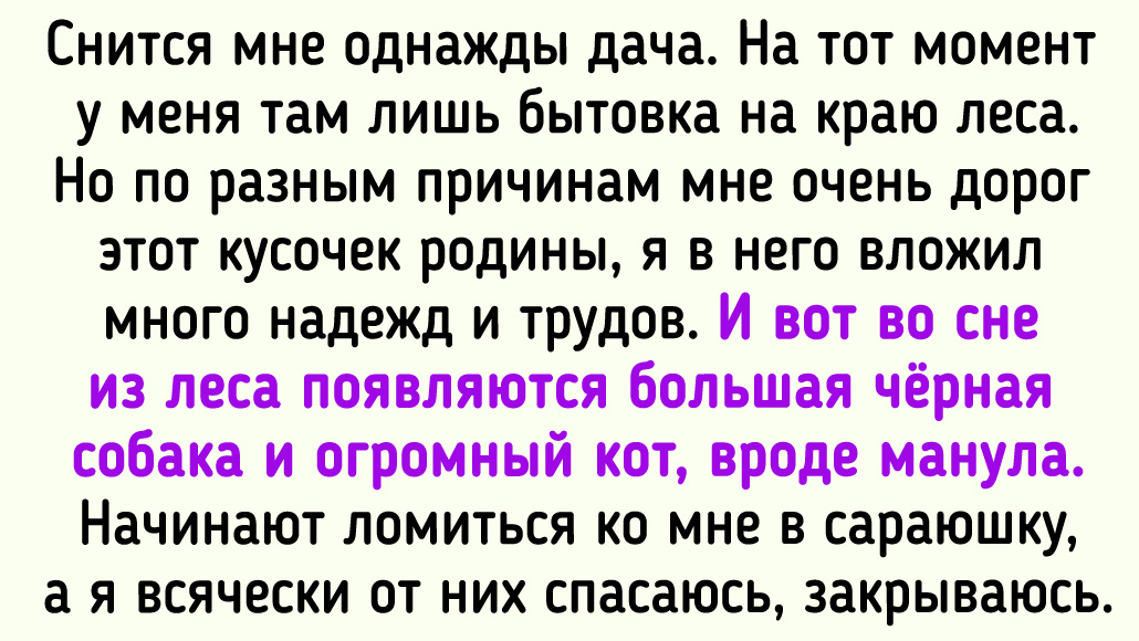 Снится мне однажды дача. На тот момент у меня там лишь бытовка на краю леса. Но по разным причинам мне очень дорог этот кусочек родины, я в него вложил много надежд и трудов. И вот во сне из леса появляются большая чёрная собака и огромный кот, вроде манула. Начинают ломиться ко мне в сараюшку, а я всячески от них спасаюсь, закрываюсь. Они лезут с разных сторон, прямо через тонкие стены. Строение сотрясается от ударов. И вот собака-волчара уже прогрызла себе дыру. Я схватил её за горло!..
