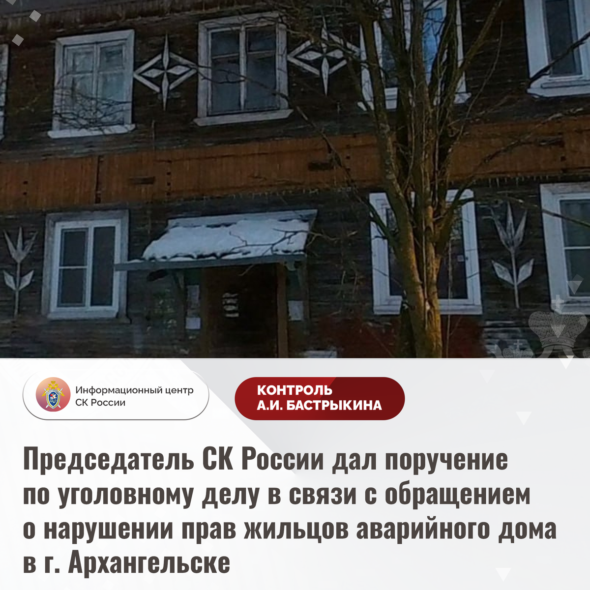 Председатель СК России дал поручение по уголовному делу в связи с обращением о нарушении прав жильцов аварийного дома в г. Архангельске В комментариях в аккаунте приёмной Председателя СК России А.И. Бастрыкина в социальной сети «ВКонтакте» размещено обращение по вопросу несогласия с ходом установления обстоятельств нарушения прав жильцов многоквартирного дома на улице Севстрой города Архангельска. Двухэтажное деревянное здание 1969 года постройки в связи со значительной степенью износа несущих конструкций признано аварийным в январе 2024 года. В декабре того же года судом на компетентные органы возложена обязанность предоставить матери заявителя благоустроенное жилое помещение во внеочередном порядке. Однако до настоящего времени права женщины не реализованы. Обращения в различные инстанции результатов не принесли, проблема не разрешена, никто к ответственности не привлечен. В СУ СК России по Архангельской области и Ненецкому автономному округу расследуется уголовное дело, по которому