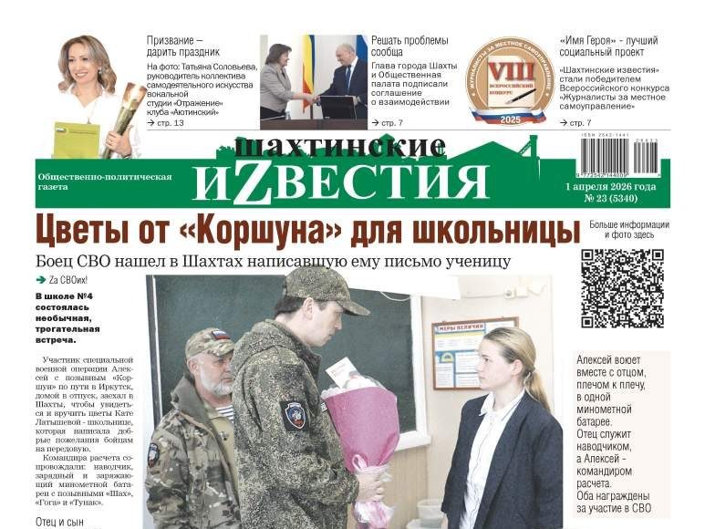 Боец СВО нашел в Шахтах написавшую ему письмо ученицу. Депутаты городской Думы проверили качество питания в школах. В школе №25 учеников 1А класса торжественно посвятили в казачат О важности участия в субботниках рассказывают члены Общественной палаты города Шахты. Глава города Шахты и Общественная палата подписали соглашение о взаимодействии В Шахтах работников культуры поздравили с профессиональным праздником Детям с расстройством аутистического спектра нужна помощь в социализации «Шахтинские известия» стали победителем Всероссийского конкурса «Журналисты за местное самоуправление» Дата образования предприятия 1 апреля 1992 года практически совпадает с Днем геолога В Шахтах общественники проинспектировали работу полиции Семиклассники лицея №11 примерили на себя бронежилет сапера Свежий номер газеты вы можете приобрести в киосках города, а также заказать электронную версию газеты по ссылке: https://shakhtinskie-izvyestiya.robo.market/ Наши контакты – e-mail: gazeta-o-nas@mail.ru