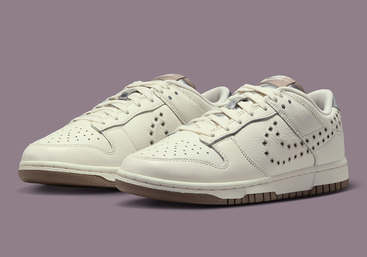 👟 Nike Dunk Low продолжает радовать новыми расцветками — от простых до смелых экспериментов. Эта женская модель относится ко второй категории: традиционный логотип Swoosh заменён на множество маленьких металлических дырок. Официальные снимки демонстрируют верх из белой кожи, контрастирующий с металлическими серебристыми вставками на язычке и заднике. Подкладка, стелька и подошва выполнены в тёмно-коричневом оттенке. Женская модель Nike Dunk Low «Sail/Mink Brown/Metallic Silver» выйдет 1 апреля 2026 года. Подробности и официальные фото доступны в материале.