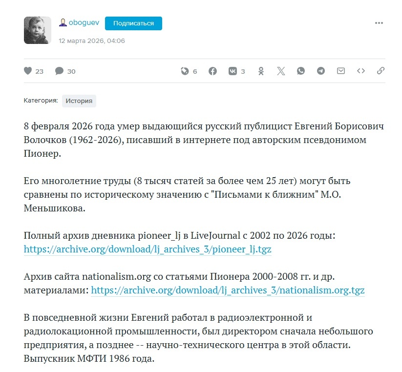 Знаковый персонаж на ниве патриотической писанины в Рунете. Лично я полагал, да и сейчас продолжаю считать, что ЖЖ «Пионера» писал не один человек, а коллектив авторов, но Сергей Обогуев назвал якобы реальное имя pioneer_lj – Евгений Борисович Волочков. https://oboguev.livejournal.com/8368189.html