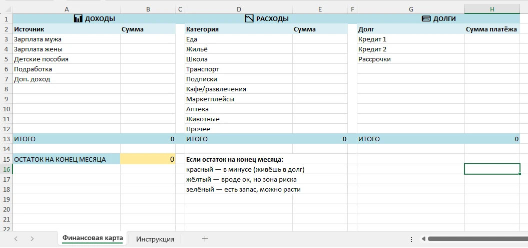 Приготовил для вас таблицу, которая покажет за 2 минуты сколько у вас остаётся денег в конце месяца и не “примерно”, а по факту. У большинства людей одна и та же ситуация: ✔️ деньги приходят ✔️ что-то тратится ✔️ в конце месяца остаётся меньше, чем ожидал И ощущение, что “ну как-то само ушло” 🤷♂️ На деле всё проще. Деньги не исчезают. Они просто размазываются по мелким тратам, которые вы не отслеживаете. Хотите понять, куда именно у вас всё уходит? Я сделал удобную таблицу “финансовая карта семьи” - она сама считает и сразу показывает реальную картину. Если хочите увидеть, где вы теряете деньги каждый месяц - забирайте таблицу в моем канале МАХ. Если было полезно - поставьте 👍