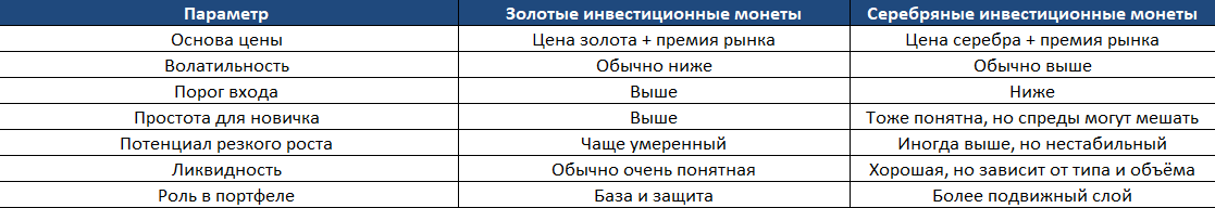 Если я начинающий инвестор и хочу минимум сюрпризов, золотые инвестиционные монеты для меня понятнее. Если хочу входить с меньшим бюджетом и готов мириться с более неровным движением, можно смотреть на серебряную инвестиционку. Но именно в сегменте инвестиционных монет я бы не ждал самого быстрого роста — тут стабильнее, а не быстрее.