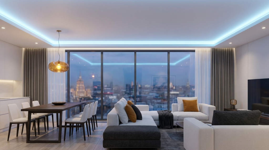 Стандартный стеновой профиль «съедает» от 3 до 5 см высоты помещения. Если перекрытия в вашей московской квартире очень неровные, этот отступ может увеличиться, чтобы вывести потолок в идеальный горизонт. Существуют также узкие профильные системы, которые позволяют минимизировать потерю высоты до 2 см, но они требуют идеально ровных базовых потолков.