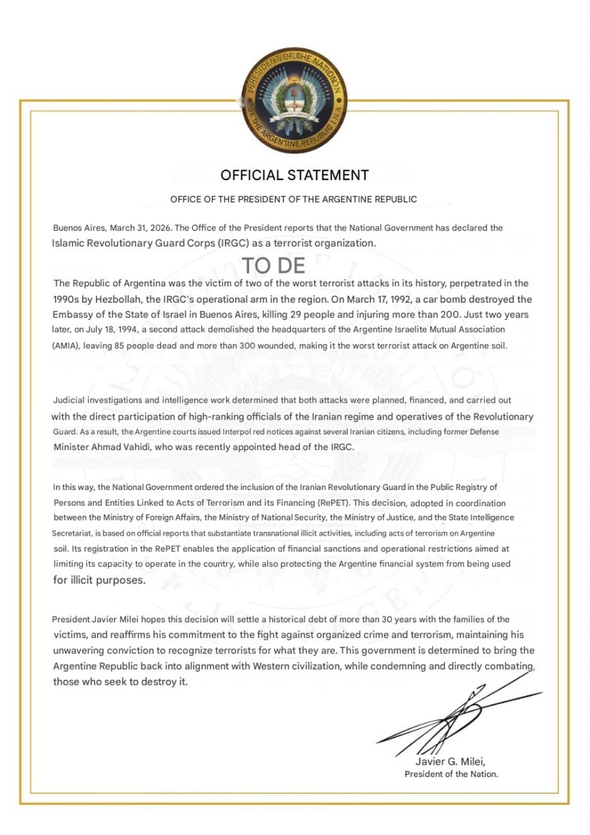 ARGENTINA'S JAVIER MILEI OFFICIALLY LABELS IRAN'S IRGC A 'TERRORIST ORGANIZATION