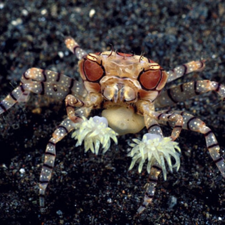 ? Маленькие крабы рода Lybia больше известны как крабы-боксёры. Такое прозвище они получили за мутуалистические отношения с актиниями, которые охотятся с помощью стрекательных клеток. Крабы подбирают актиний и держат их в клешнях с целью защиты. Актинии, в свою очередь, благодаря крабам получают мобильность, ведь самостоятельно передвигаться они не могут. Это даёт им возможность захватывать своими щупальцами большее количество пищи. Wikipedia / Lybia https://en.wikipedia.org/wiki/Lybia