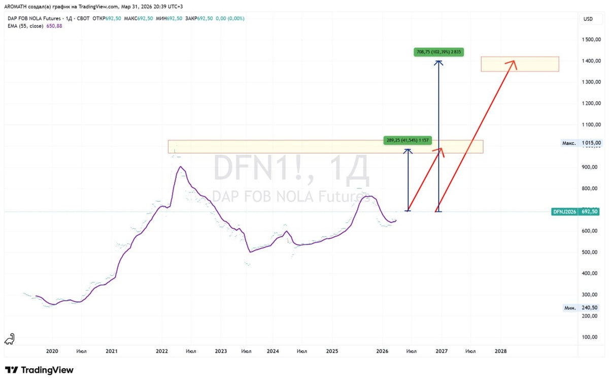 🌽 Мировая продовольственная инфляция 🚜 График фьючерсов на DAP удобрения. Диаммонийфосфат / ДАФ, NP 18:46) - это высококонцентрированное, водорастворимое гранулированное азотно-фосфорное удобрение (18% азота, 46% фосфора). Является универсальным стартовым удобрением, наиболее эффективным для развития корневой системы, повышения морозостойкости и урожайности всех культур на почвах с низким или средним pH. 🌾 Сайт ФосАгро. Основные факторы, влияющие на цену DAP: Высокий спрос: Фосфорные удобрения остаются востребованными для обеспечения роста сельскохозяйственных культур. Стоимость сырья: Рост цен на фосфорное сырье и аммиак влияет на конечную стоимость. Логистика: DAP — это также условие поставки (Delivered At Place), при котором цена включает доставку до места назначения. Классическая чашка с ручкой нас ждет и здесь с превышением ценой всех исторических максимумов. ВТБ аналитики еще такого не читали в AROMATH и по РБК не рассказывают. У нас в мире скоро могут быть цены стабил