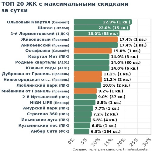 🟩 Честные скидки: 33 ЖК (410 кв.) 🟧 Маркетинг скидки: 17 ЖК (71 кв.) 💎 МАКСИМАЛЬНАЯ ЭКОНОМИЯ 🏆 Эталон • Шагал ├🔻7.8M → 35.3M • 2-к 78м² └🔻6.5M → 65.1M • 1-к 157м²❗️ 🥈 Пионер • HIGH LIFE └🔻4.3M → 50.4M • 2-к 52м² 🥉 A101 • Южные сады ├🔻4.1M → 29.2M • 4-к 92м² └🔻4.1M → 29.1M • 4-к 92м² 4️⃣ 1 ДСК • 1-й Лермонтовский ├🔻3.5M → 19.4M • 3-к 84м² ├🔻3.4M → 18.8M • 3-к 84м² └🔻3.4M → 18.6M • 3-к 84м²❗️ 5️⃣ Самолёт • Ольховый Квартал └🔻3.4M → 14.9M • 2-к 43м² 🔑 САМЫЕ ДОСТУПНЫЕ 🏆 Самолёт • Космический Квартал ├🔻101к → 5.0M • Студия 23м² └🔻117к → 5.9M • Студия 23м² 🥈 Самолёт • Пятницкие Луга ├🔻63к → 6.3M • 1-к 37м² └🔻63к → 6.3M • 1-к 37м²❗️ 🥉 Самолёт • Прибрежный Парк ├🔻87к → 6.5M • Студия 26м² ├🔻88к → 6.6M • Студия 26м² └🔻88к → 6.6M • Студия 26м² 4️⃣ A101 • Родные кварталы ├🔻1.0M → 7.4M • Студия 21м² └🔻1.1M → 7.8M • Студия 24м² ❗️— лоту меньше месяца 👇 Полная статистика: 📲 В Telegram | 🌐 На MskMeter.ru