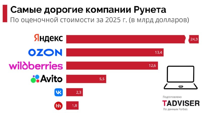 📈 Совокупная стоимость лидеров российского интернета за 2025 год выросла на 47%. На первый взгляд — триумф, но если заглянуть «под капот», картина становится неоднозначной: — Половина всего прироста ($14,5 млрд из $29 млрд) — это не реальное развитие, а результат укрепления рубля. — Динамика роста бизнеса замедлилась почти вдвое — с 45% в 2024 году до 27% в 2025-м. — Маркетплейсы — локомотив: Несмотря на общее замедление, этот сектор показал рост капитализации на 70%, достигнув оценки в $28 млрд. В список вошли 30 компаний, которые фактически формируют 95% стоимости всего цифрового сегмента страны. Подробный разбор и полный список участников — в материале TAdviser. 📲 MAX 👮♂️ VK ☺️ДЗЕН ✈️ TG #Психология #Менеджмент #Карьера #исследование