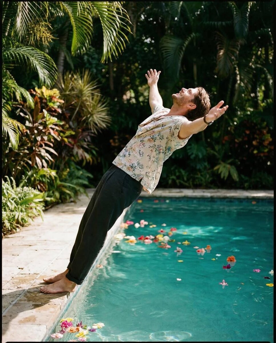 Сгенерировать фото⚡️ Перейти в бота 🤖 Создайте кинематографическую фотографию на открытом воздухе с естественной тропической атмосферой, вдохновленную артхаусными летними фильмами. Композиция: Горизонтальный кадр. Видно все тело. Объект расположен немного смещенно от центра. Объект падает назад в бирюзовый бассейн с края. Тело наклонено по диагонали над водой. Ноги все еще касаются края бассейна, а верхняя часть тела находится над водой. Руки широко раскинуты. Поза: Руки вытянуты к небу в расслабленной открытой позе. Торс выгнут назад. Голова наклонена вверх к солнечному свету. Поза кажется спонтанной и в движении, а не постановочной. Выражение лица: Расслабленное радостное выражение. Лицо повернуто к свету. Волосы: Короткие, слегка растрепанные волосы с естественным движением. Одежда: Светлая свободная рубашка с короткими рукавами и мягким цветочным принтом. Рубашка частично расстегнута, обнажая торс. Темные свободные брюки прямого кроя. Босиком. Окружение: Бирюзовый бассейн