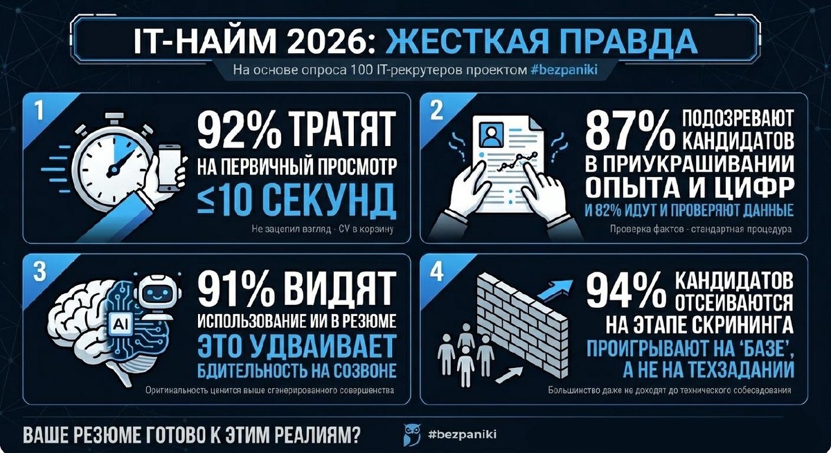 🔍 Мы в #bezpaniki провели исследование: задали 24 вопроса сотне нанимающих профи. Цифры говорят громче любых карьерных советов. Вот краткая выжимка того, во что вы упираетесь ежедневно: ❌ 10 секунд. Столько времени 92% рекрутеров тратят на первичный просмотр вашего резюме. Если за это время «глаз не зацепился» — вы в корзине. ❌ Тотальное недоверие. 87% рекрутеров подозревают кандидатов в приукрашивании опыта, а 82% — идут и ПРОВЕРЯЮТ ваши цифры и результаты. ❌ Смерть от ИИ. 91% нанимателей видят использование нейросетей в резюме. И если для кого-то это ок, то для большинства это повод удвоить бдительность на созвоне. ❌ Проблемы на входе. 94% кандидатов отсеиваются на этапе первого скрининга. Рынок 2026 года — это не про «кто лучше работает», а про «кто лучше упакован и готов защитить свой опыт». На этой неделе мы будем разбирать эти данные и учиться обходить эти ловушки. Весь отчет опубликуем совсем скоро. Но если ваше резюме прямо сейчас не работает — не ждите. Приходите н