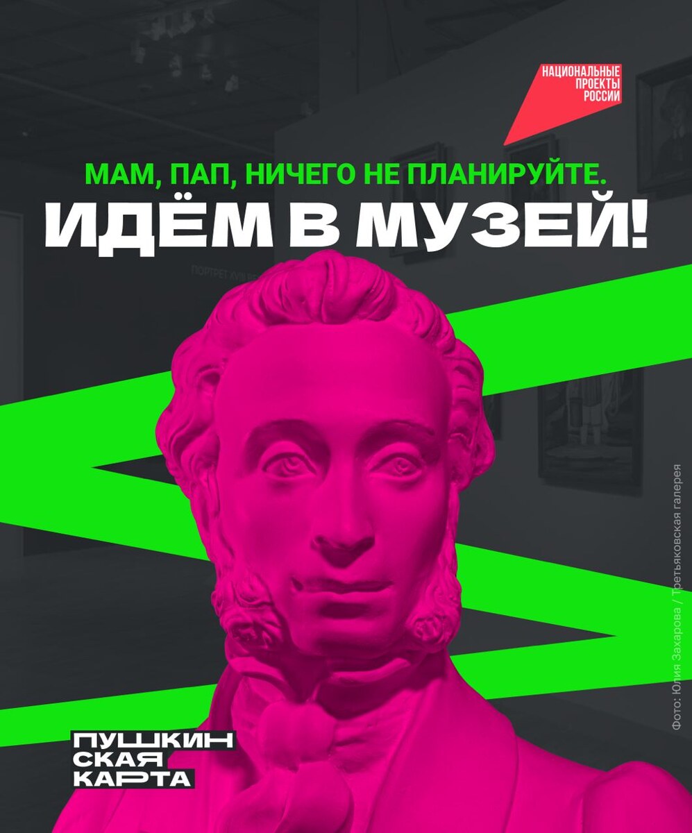 ! А ещё — в театр, на выставку или на концерт! С 21 марта по 5 апреля по всей стране проходит акция «Веди родителей в музей». Участвовать могут все держатели Пушкинской карты. Как это сделать: 🎟 купить билет по карте; 🤌 получить скидку 10% на билет для родителей! В этом сезоне к акции присоединились 1100 театров, музеев, выставочных комплексов и филармоний из 70 регионов страны. Смотрите их полный список на сайте. По нацпроекту «Семья» Пушкинскую карту могут получить молодые люди от 14 до 22 лет. Каждый год на неё начисляют 5 000 руб. на концерты, выставки и другие культурные мероприятия, а 2 000 руб. из них можно потратить на кино!