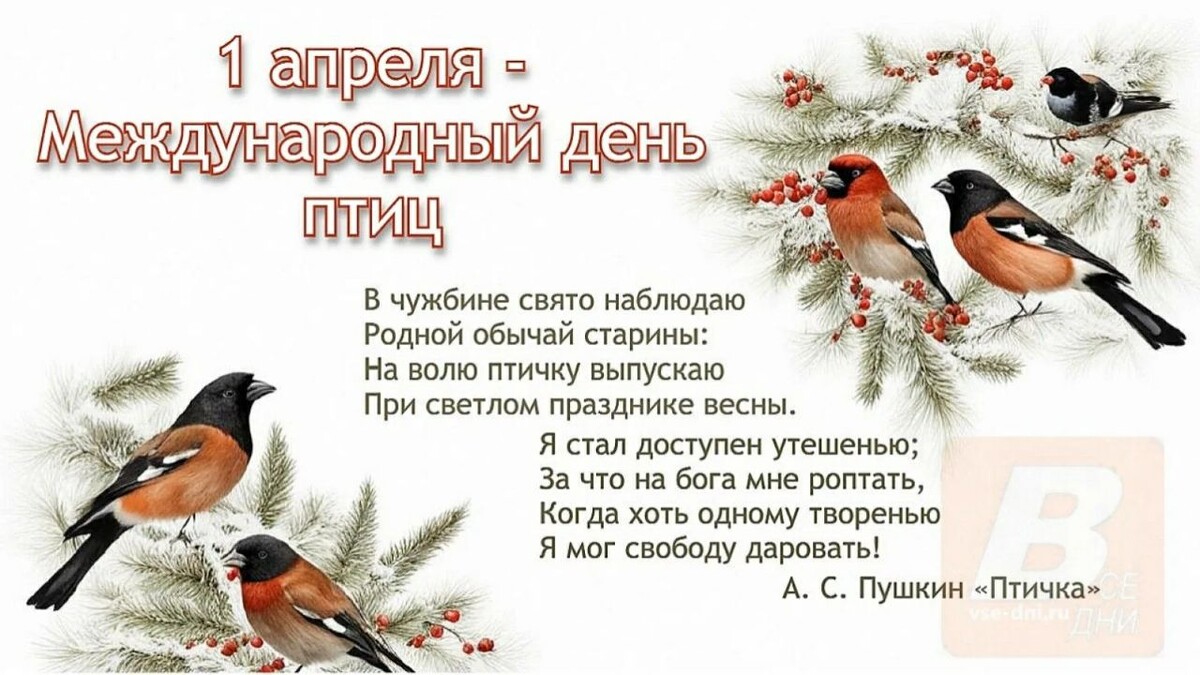 1 апреля 2026 года - Международный день птиц.