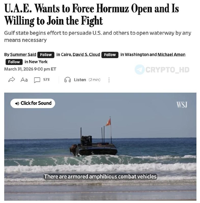 🇦🇪🇮🇷 ОАЭ готовы вступить в войну с Ираном ради открытия Ормузского пролива. Правительство ОАЭ сигнализирует о готовности перейти от дипломатии к силовому сценарию, если поставки через Ормузский пролив не возобновятся. Речь идет о возможном участии в военных действиях для обеспечения свободного прохода танкеров. Ранее: угрозы Дональда Трампа Crypto Headlines