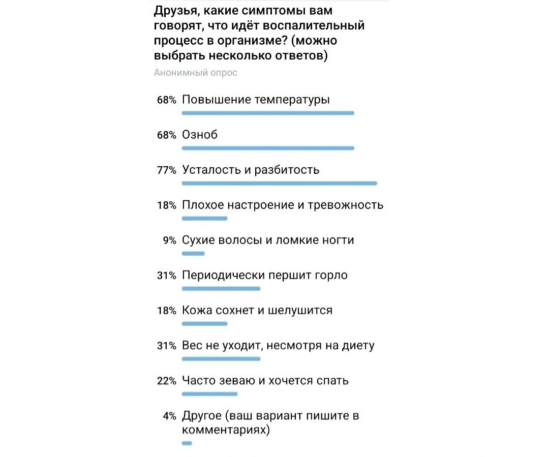 ?💥 (начало - тык сюда😉) Если нет температуры, значит всё нормально? Вот тут большинство и ошибается… Судя по опросу, вы считаете воспалением температуру, озноб, «разбитость», тревожность 💯 Но хроническое воспаление -тихое, без явных симптомов... поэтому его не замечаете годами. А в это время тело уже активно подает сигналы: 1️⃣ Постоянная усталость Вы спите, отдыхаете, а сил нет, потому что иммунная система работает 24/7, как при инфекции. Ваша энергия уходит не на жизнь, а на внутреннюю борьбу. 2️⃣ Отеки, которые не проходят Лицо утром, живот к вечеру, тяжесть в ногах. Это не вода, а воспаление + нарушенный лимфоток. Когда печень и ЖКТ перегружены, то тело начинает откладывать лишнее в ткани. 3️⃣ Тревожность и туман в голове Кишечник напрямую влияет на мозг. Если он не в порядке, то падает серотонин. Вы это чувствуете: появляется раздражительность, рассеянность, нет концентрации. 4️⃣ Проблемная кожа Высыпания, зуд, дерматиты. Кожа — это орган выведения. Если печень и кише