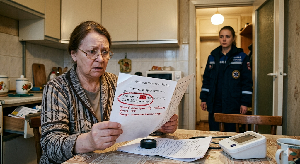 И сбоку её мелким, убористым почерком: «Срочно к нефрологу. Ночной мониторинг АД — стабильно выше 170. Угроза гипертонического криза».