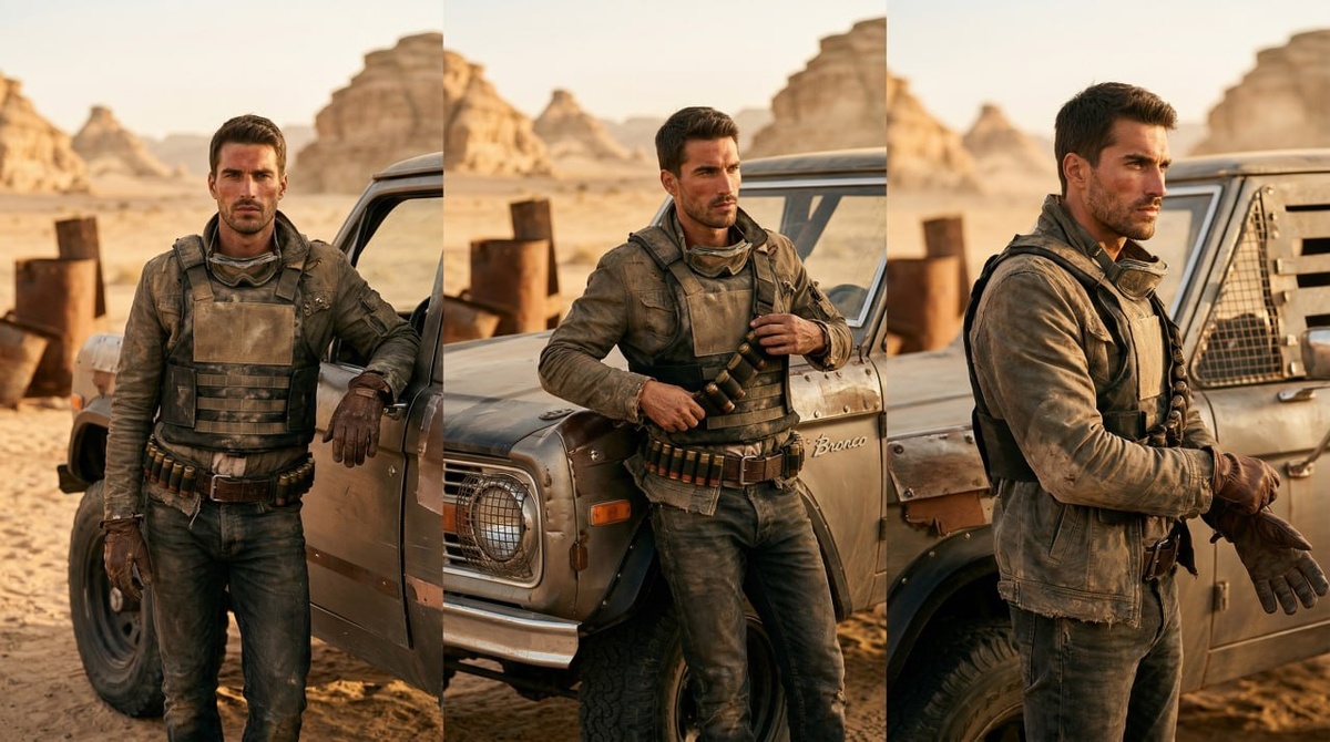 ". 🧠 Prompt: SAVE FACIAL FEATURES FROM THE REFERENCE PHOTO: Against the backdrop of a vast post-apocalyptic desert, where eroded sandstone cliffs and metal debris are lost in the haze, the man in the uploaded photograph stands next to a powerful, modernized vintage SUV. The character's appearance is enhanced by dusty tactical goggles clinging to his neck, a handmade bulletproof vest, belts with ammo pouches, cracked leather gloves, and a tattered jacket bearing the marks of past battles. His gaze is a mixture of fatigue and determination; his skin is sunburned, and a layer of sand and dust is visible on his face. The atmosphere is charged with tension—a dry wind blows tiny particles of sand through the air, and the entire space seems cut through by reflections and waves of heat. The composition is constructed as a wide-angle cinematic shot in the spirit of the best National Geographic issues. The picture is filled with the golden, smoothly flowing light of dawn; The soft light of the
