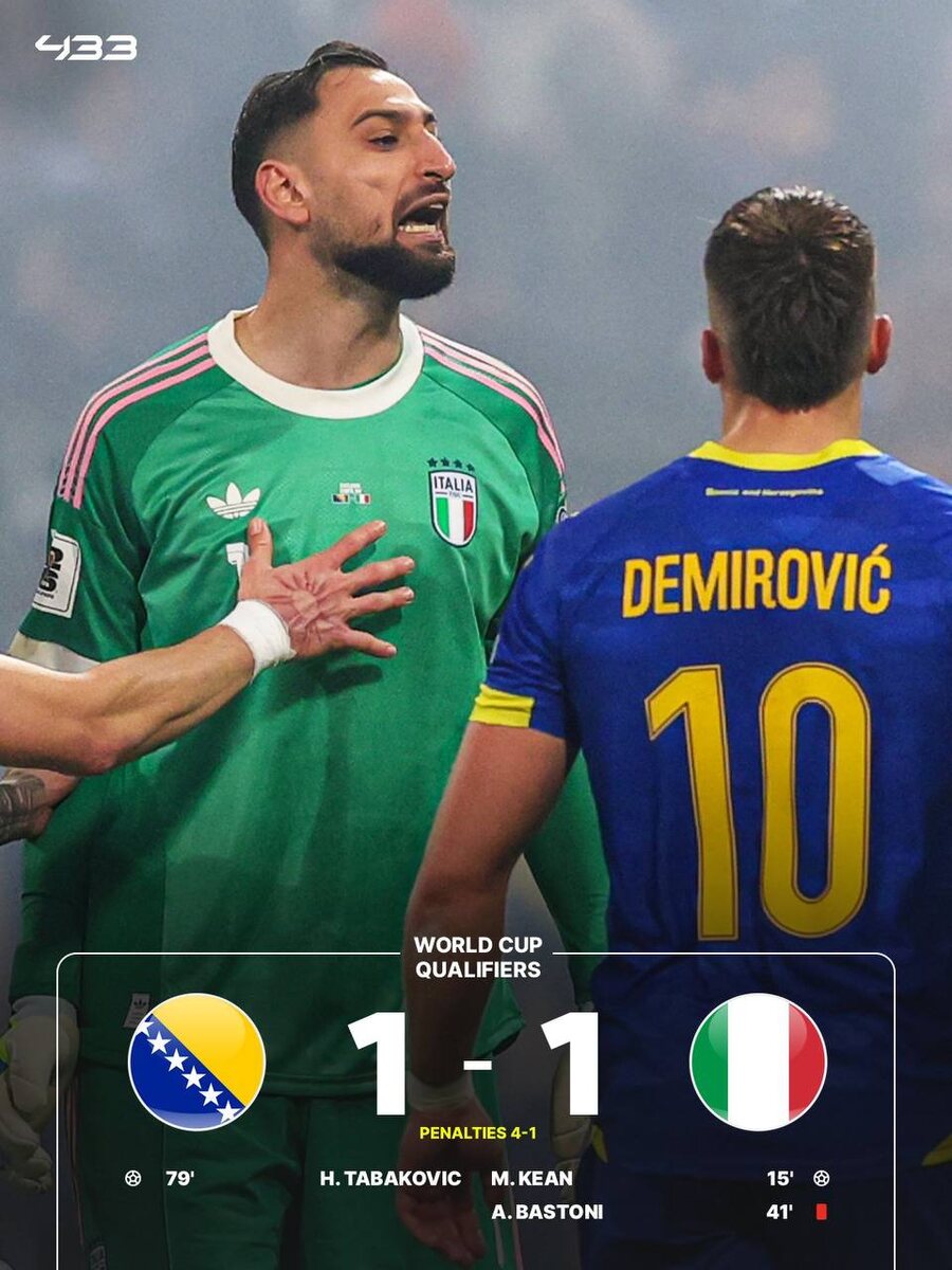 Основное и дополнительное время встречи в Зенице завершились со счетом 1:1. У итальянцев гол забил Мойзе Кин, в составе Боснии и Герцеговины отличился Харис Табакович. В серии пенальти хозяева поля победили — 4:1. ⚽️ Подписывайтесь на нас в MAX