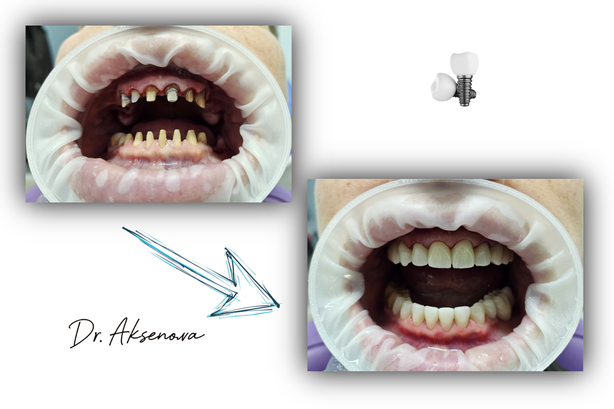 Пациент пришёл с двумя проблемами: заниженный прикус (зубы стёрлись, лицо «просело») и отсутствие жевательных зубов в боковой группе. Самый простой путь - удалить всё, поставить импланты на обе челюсти и забыть. Но простой - не всегда правильный. Свои зубы, даже если они стёрты, это живая ткань, естественная амортизация, привычная анатомия. Выкидывать их без необходимости - это расточительство. Как мы поступили: