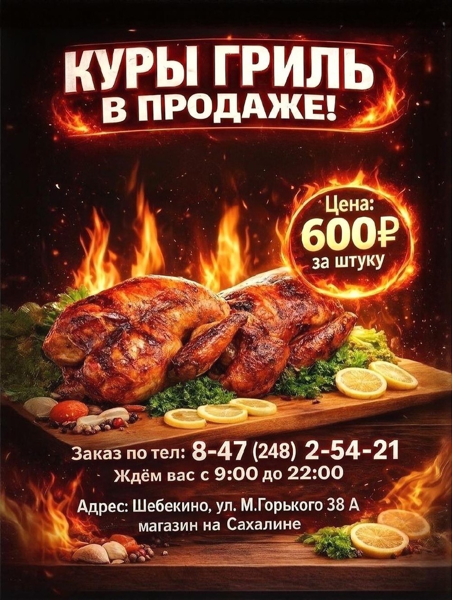 ! Друзья, в нашем магазине на Сахалине — свежая ароматная курочка с хрустящей корочкой! 🍗 💥 Цена: 600 рублей за штуку! Идеальный ужин без хлопот. У нас также широкий выбор продуктов и товаров первой необходимости — всё в одном месте! 📍 Адрес: Шебекино, ул. М. Горького, 38 А 🕘 Режим работы: с 9:00 до 22:00 📞 Заказ по телефону: 8-47 (248) 2-54-21 вШбк 🇷🇺 Шебекино | 📝Написать нам | Мы в MAX | Мы в ВК