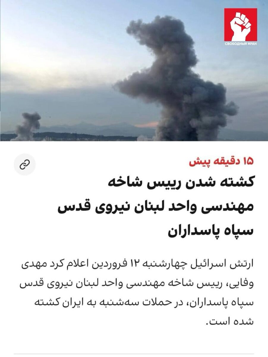 🚀💥 Израильская армия заявила, что в ходе ударов по Ирану был убит Мехди Вафаи — глава инженерного отдела ливанского подразделения сил Кудс КСИР. По данным ЦАХАЛ, он два десятилетия курировал подземные проекты в Ливане и Сирии, включая объекты для Хезбаллы и режима Башара Асада. В Израиле утверждают, что Вафаи был одним из ключевых кураторов сети подземных сооружений для хранения оружия, а его устранение может ослабить эту инфраструктуру. Подпишитесь на канал