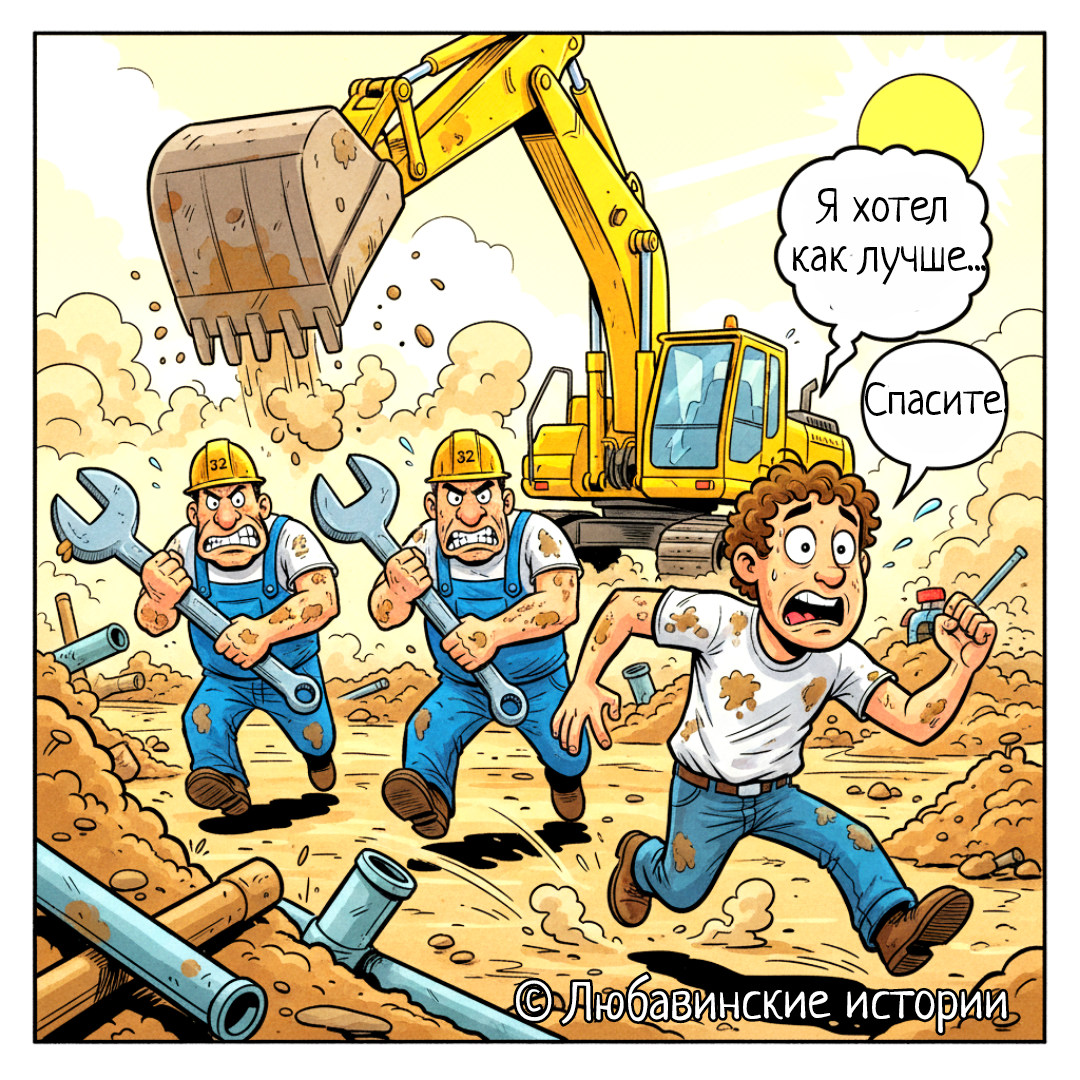«Женька закончил копать траншею и увидел открытый люк теплоузла. Решив проявить гражданскую бдительность, он накрыл люк ковшом экскаватора! Оказалось, что внутри после смены как раз отдыхала вся бригада сантехников... с бутылочкой! Они там в спасительном тенёчке и прикорнули тихонько. Представьте их ужас, когда они проснувшись в темноте да в тесноте, не смогли понять, как им оттуда теперь выйти! А дело было в пятницу вечером. Впереди выходные. — Почти три дня! Шутка ли?! В четырёх квадратных метрах!!! Представьте себе!.. И вот наша тройка вполне уже озверевших сантехников… можете представить себе это шоу! Все ребята сурьёзные, грубые, немногословные и на руку тяжёлые… А тут, когда Женька, предусмотрительный наш, — подстёбывая, добавил Михалыч, — поднял свой ковш, они ж, естественно, жаждали крови, видимо, уже до такой степени, что повыскакивали оттуда, как черти из преисподней! А морда у каждого страшнее, чем у самого Квазимоды! А в руках ключи: у кого разводной, а у кого и на тридцать два… Женька как увидел весь этот апокалипсис, направляющийся по его душу… сдуло его из кабины экскаватора со скоростью звука! И тут такое началось!!!