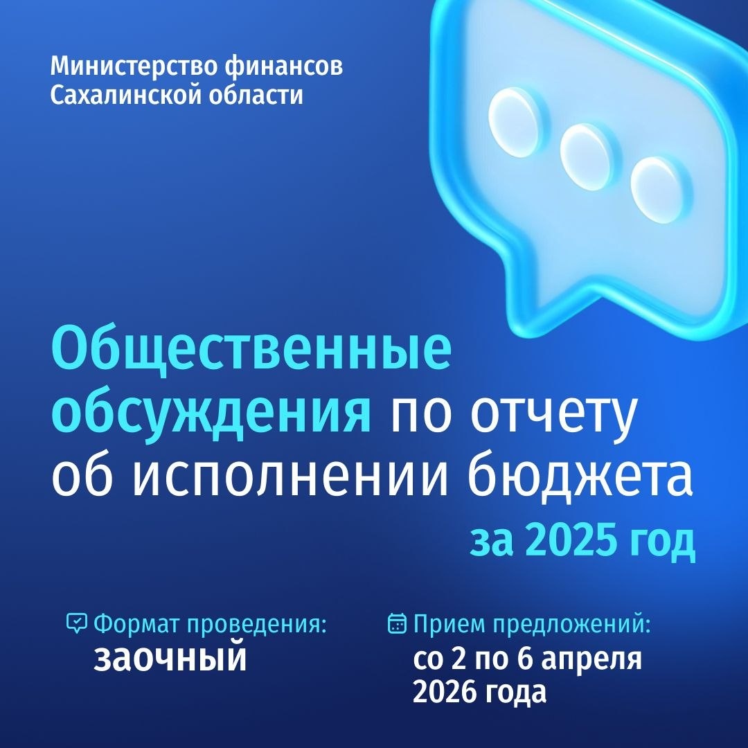 год! В этом году мероприятие проводится в заочной форме – вы можете направить свои замечания, предложения и вопросы. ❗️ ❗️ Ваше мнение важно! Обращения принимаются со 2 по 6 апреля 2026 года. 👉 Как принять участие? Направьте предложения, замечания и вопросы через приемную на сайте Губернатора и Правительства Сахалинской области (в тексте сообщения укажите тему «Участие в общественных обсуждениях»). Лично обратитесь по адресу: г. Южно-Сахалинск, Коммунистический проспект, 39 В, каб. 101, с 09.00 до 17.00. 📚 Ознакомиться с проектом закона и брошюрой «Бюджет для граждан» можно на портале Открытого бюджета Сахалинской области. Протокол обсуждений с вашими предложениями и результатами их рассмотрения будет опубликован не позднее 20 апреля. Ваше активное участие поможет сделать бюджет прозрачнее и эффективнее! 💼 ✨