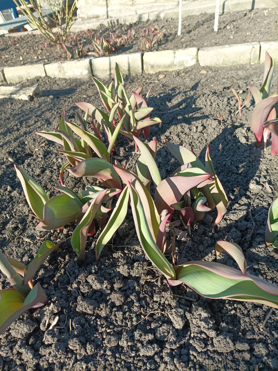 Листья тюльпанов уже достигли высоты 10–15см, но цветочных стрелок пока не видно. Это отличный знак: луковицы здоровы и активно набирают силу. Сейчас важно не тревожить посадки без необходимости. Если почва уплотнилась, можно аккуратно прорыхлить междурядья, чтобы обеспечить доступ кислорода к корням.