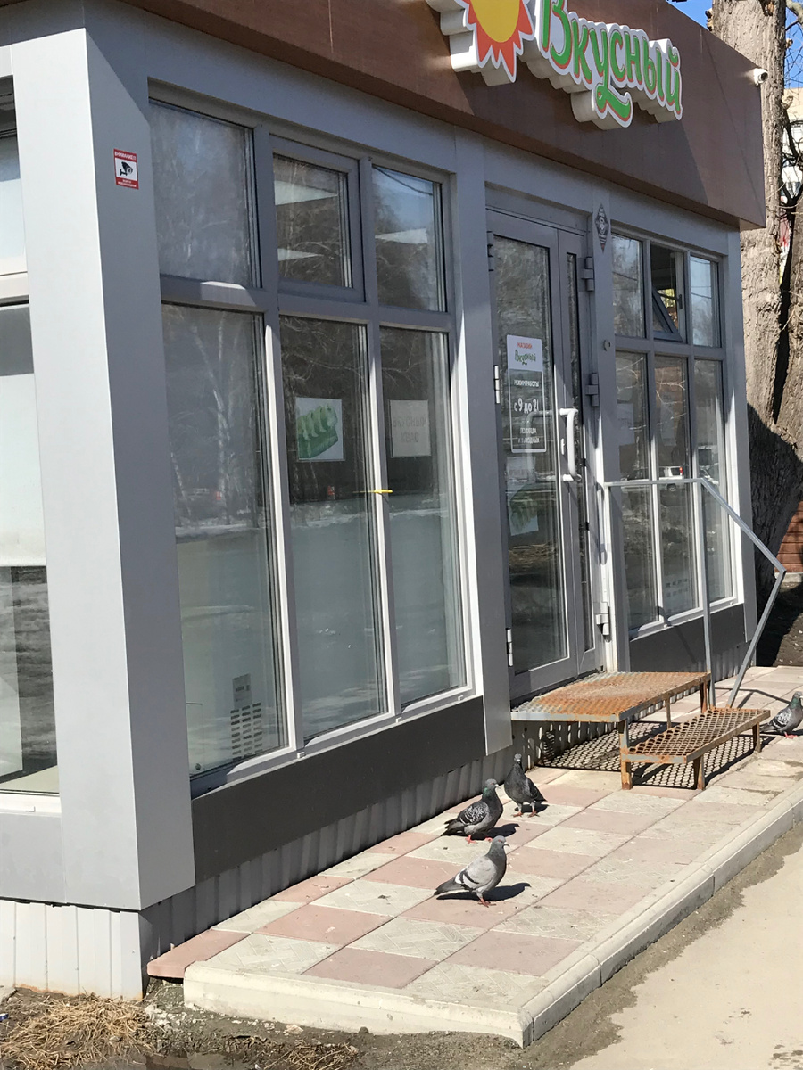 В любую погоду, хоть в холод, хоть в жару, а голуби всегда пасутся возле этого «Вкусного» магазинчика. Вначале там караулил один, всегда на посту. А вчера смотрю - позвал в гости ещё.