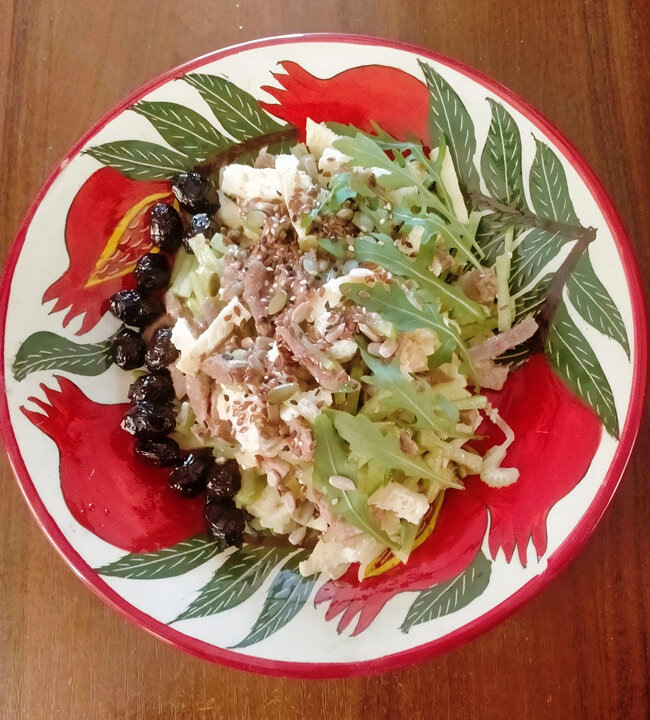 ✔ Язык варёный (говяжий) — 200 г; ✔ Редька зеленая —½ шт.; ✔ Лук —1 шт.; ✔ Яйца — 2 шт.; ✔ Сельдерей —1 стебель; ✔ Семечки подсолнечные — 10 г; ✔ Рукола — 10 г; ✔ Маслины (без косточек) —4-5 шт.; ✔ Масло растительное (для пассеровки лука) — 1 ст.л.; ✔ Масло растительное (для смазывания формы) — 1 ч. л.; ✔ Масло оливковое (для заправки) — 1 ст. л.; ✔ Лимонный сок —1 ч. л.; ✔ Соль, перец — по вкусу. По классическому рецепту нужна отварная говядина. У меня были куски отварного языка, оставшиеся от красивой нарезки. Язык нарезала соломкой. Небольшую луковицу, нарезанную полукольцами, спассеровала-занежила в столовой ложке растительного масла на самом малом огне. Половинку зелёной редьки нарезала тоненькой соломкой и перемешала с ещё горячим луком. Два куриных яйца хорошенько взбила вилкой с солью, вылила на смазанное маслом блюдо и отправила в микроволновку на 2,5 минуты. Нарезала тоненькой «лапшой» прямо в тарелке. Как можно мельче нарезала стебель сельдерея. Это уже чистая отсебятина :)
